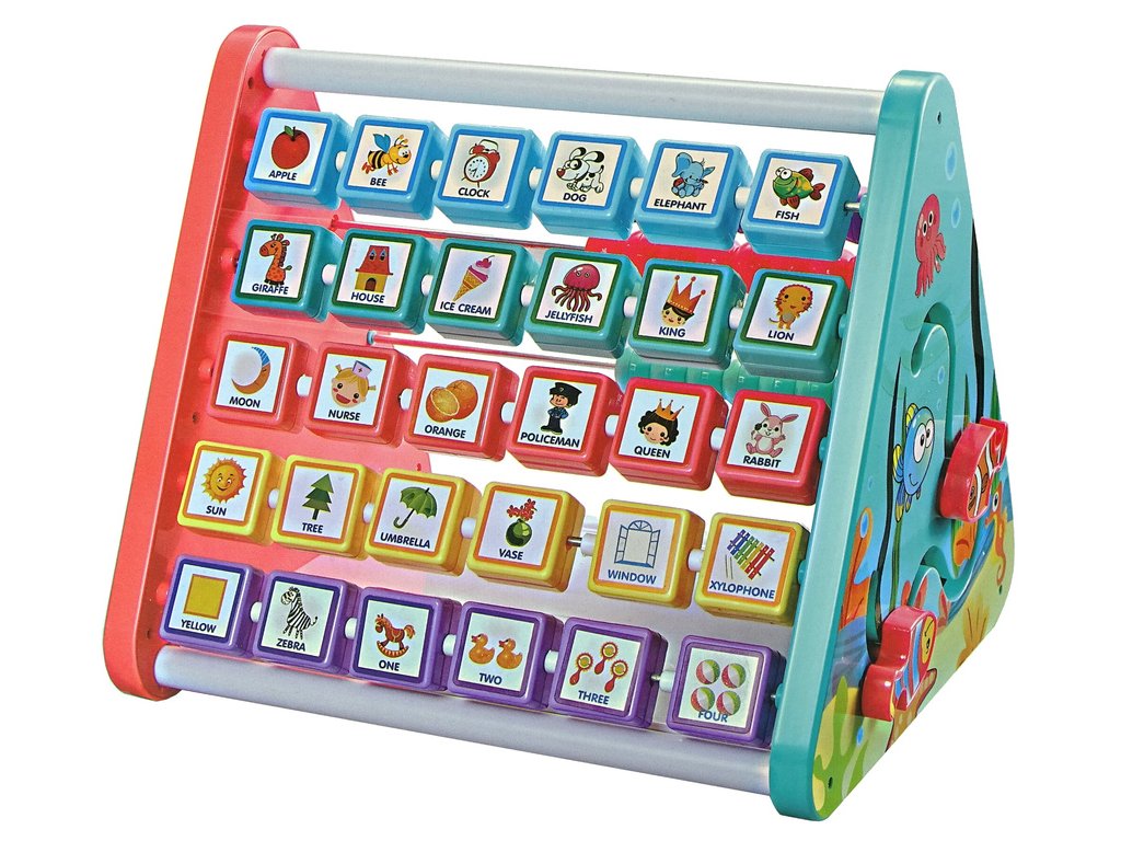 - Multifunkční design zahrnuje hodiny, tabuli, počítadlo, bludiště a čtverečky s obrázky