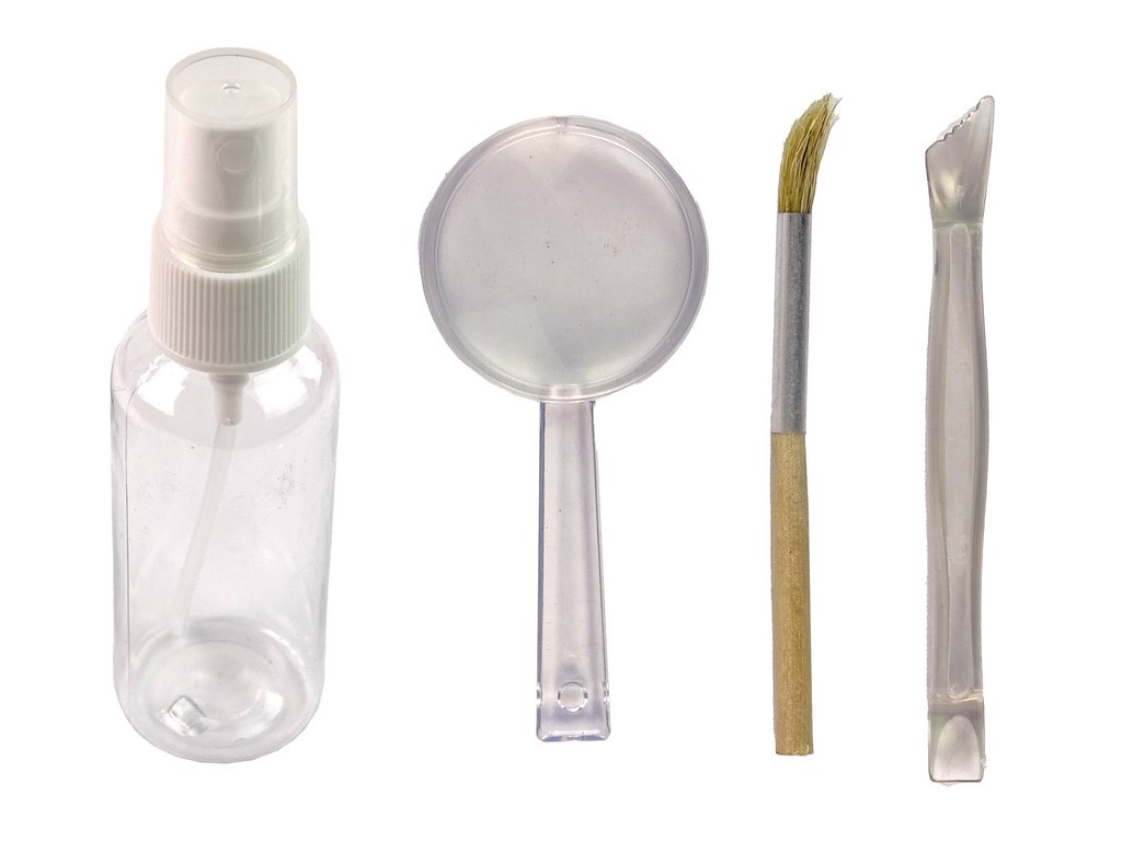 - Nástroje jako láhev na vodu, přesný kartáček a nástroj na kopání