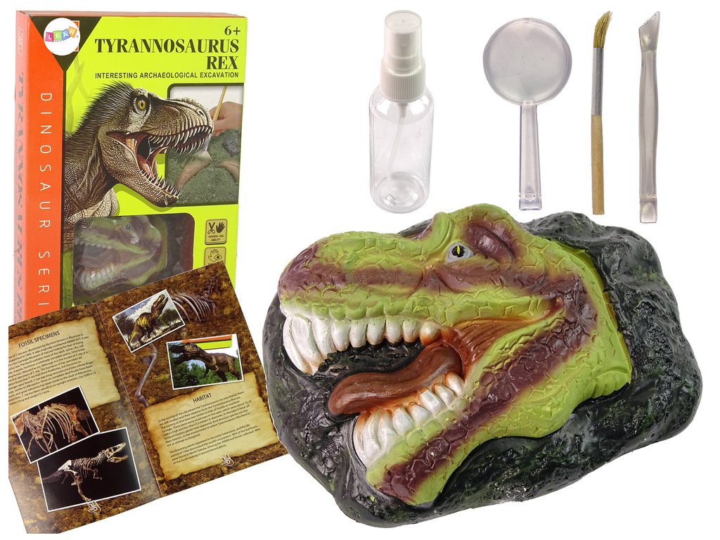 - V sadě najdete všechny nástroje, které malý archeolog potřebuje: realistickou fosilii tyranosaura o rozměrech 14 cm x 11 cm, láhev na vodu, přesný kartáček na jemný prach, lupu a nástroj na kopání