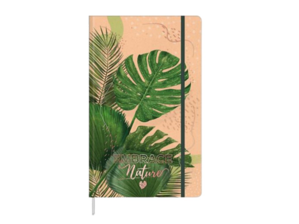 - Pevné **béžovo-zelené desky** s **tropickými listy** a inspirativním nápisem „Embrace Nature“ vám dodají chuť ke každodennímu zapisování