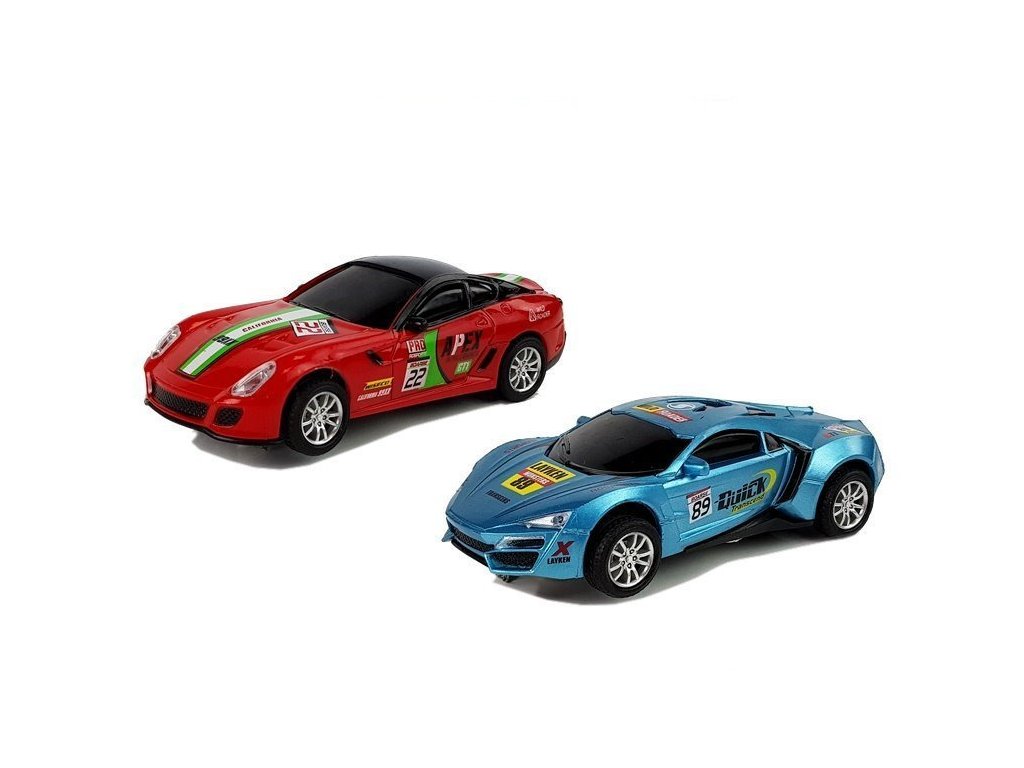 - Dvě závodní autíčka v měřítku 1:43, vybavená barevnými diodami pro efektní večerní jízdy