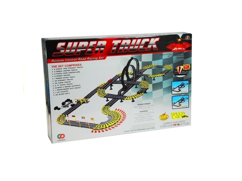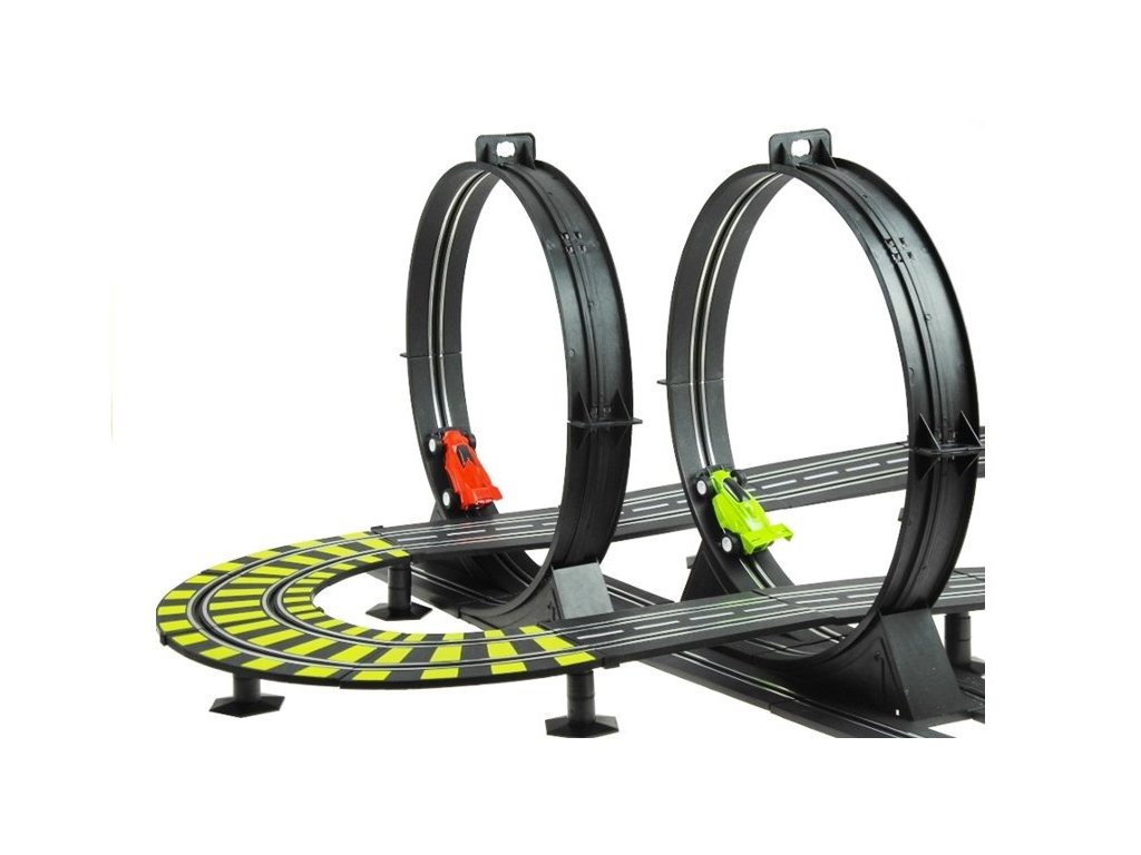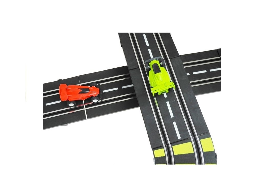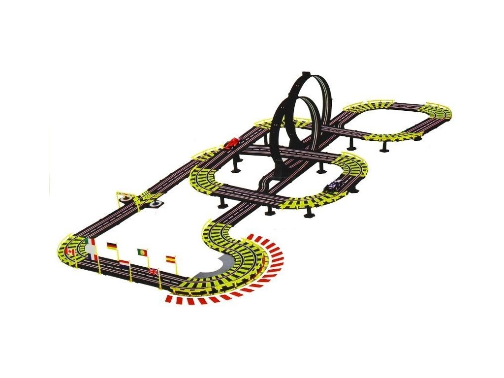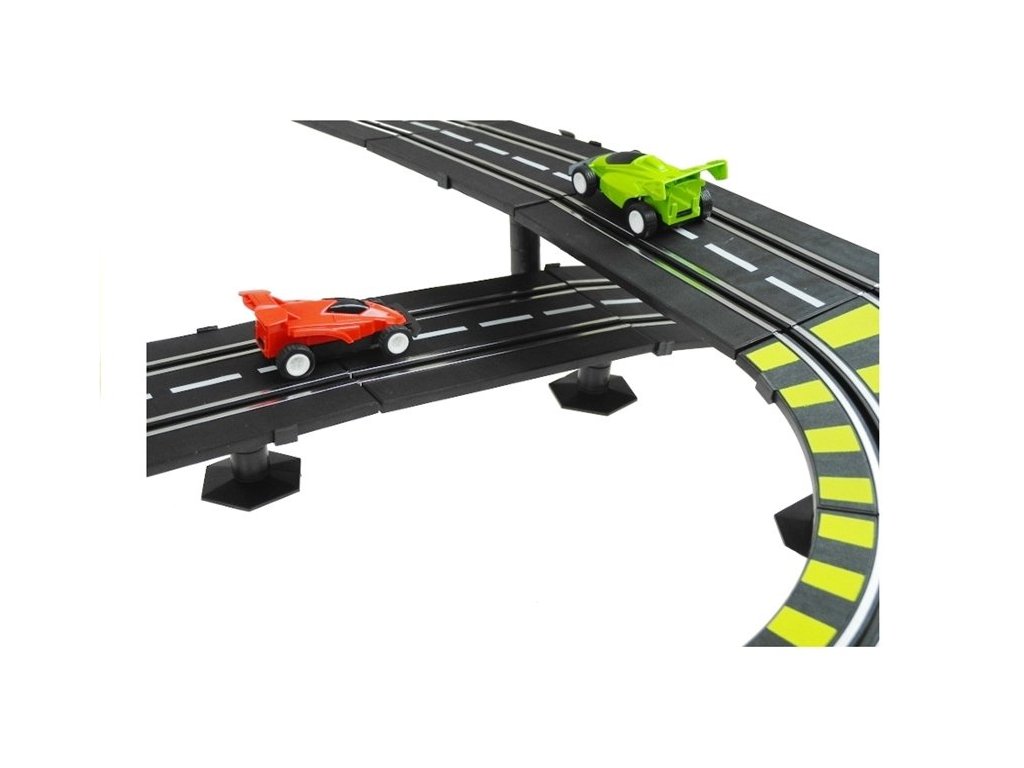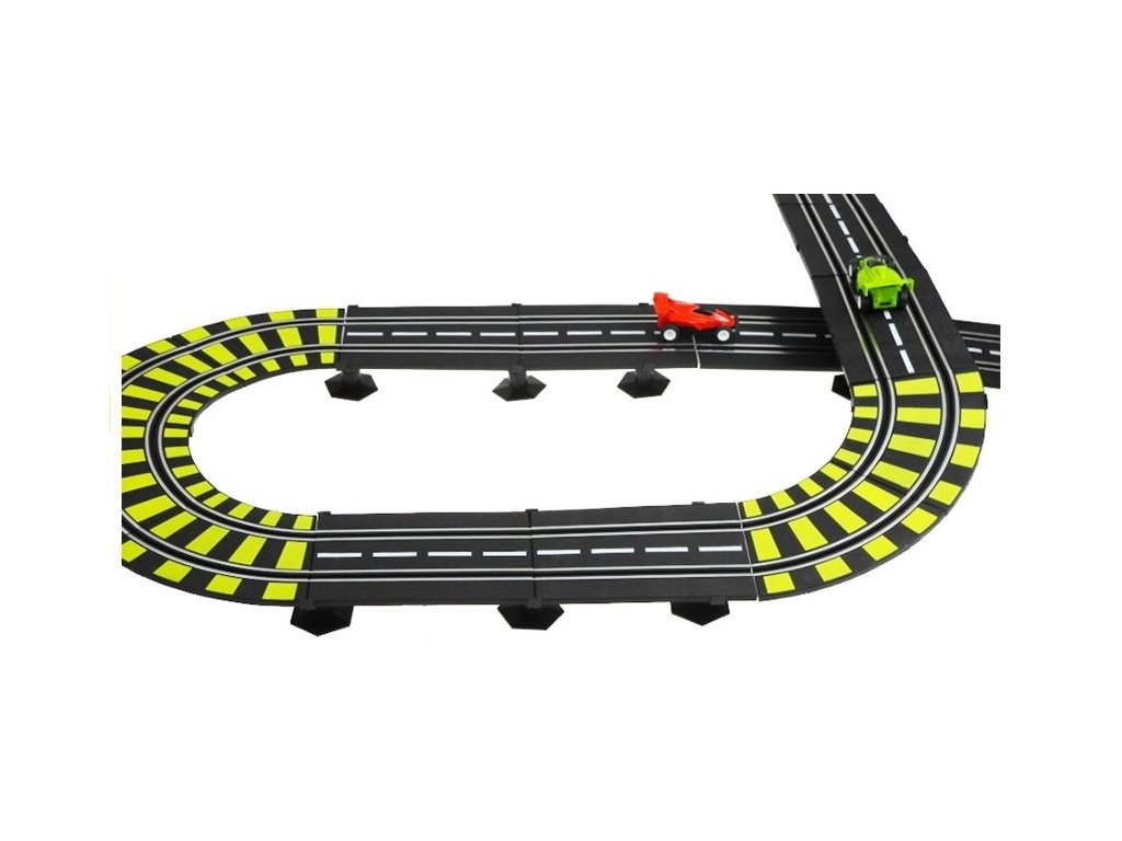Závodní dráha 11 metrů + 2 autíčka Napájecí zdroj Dráha o délce 1157 cm s okruhy, síťovým napájecím zdrojem 230 V, počítadlem kol, bariérami , které zabraňují vypadnutí autíček, mostem, tribunami a tunelem, „horami“ a „vodopádem“, mezi nimiž se odehrává napínavý závod.