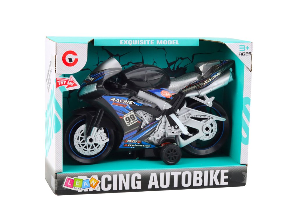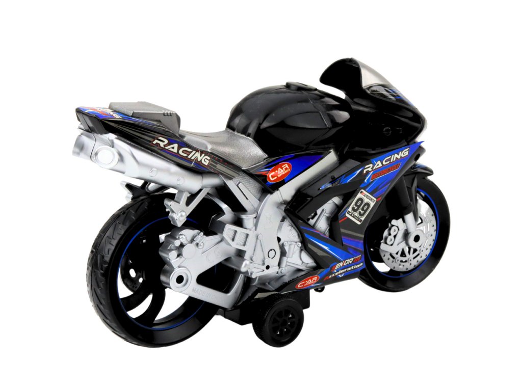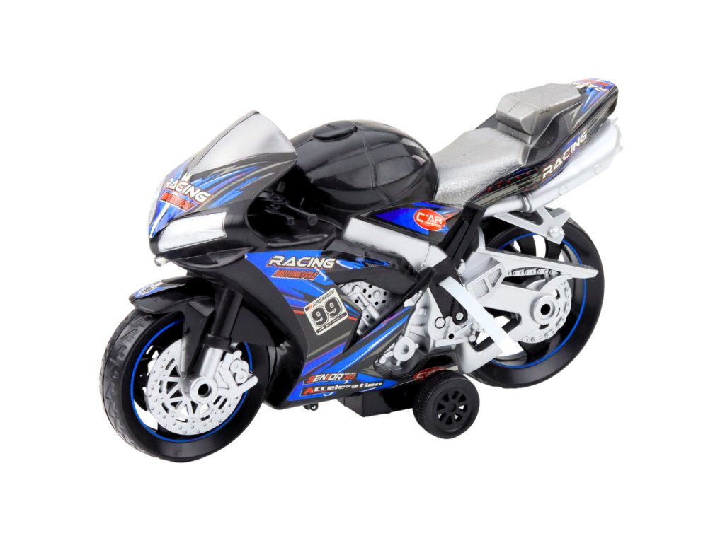 - Závodní motorka Hračka Pohon Světla Zvuky Černo-Modrá je dynamická a efektní hračka navržená pro děti, které se zajímají o motorové sporty, závody a rychlá vozidla