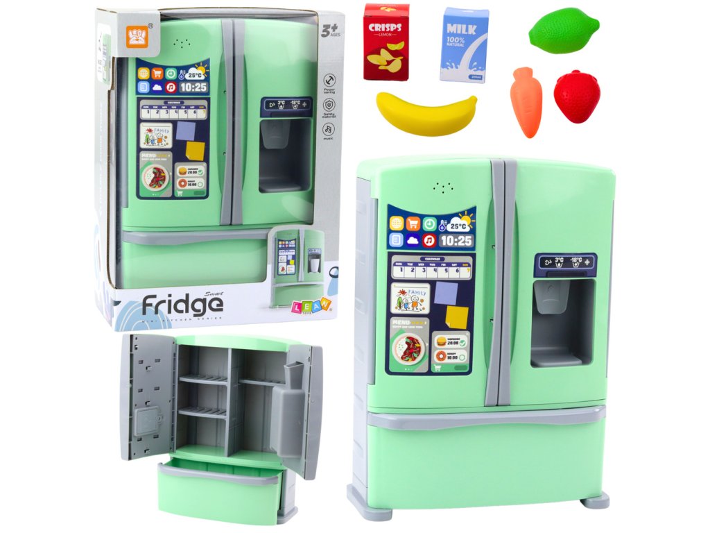 Zelená Dvoudveřová Lednice s Výrobníkem Ledu a Zvučnými Potravinovými Doplňky je vynikající volbou pro děti, které si rády hrají na běžný život Tato hračka je stylizovaná jako moderní kuchyňský spotřebič a má dvoukřídlové dveře, interaktivní panel s grafickým dotykovým displejem, a vestavěný výrobník ledu