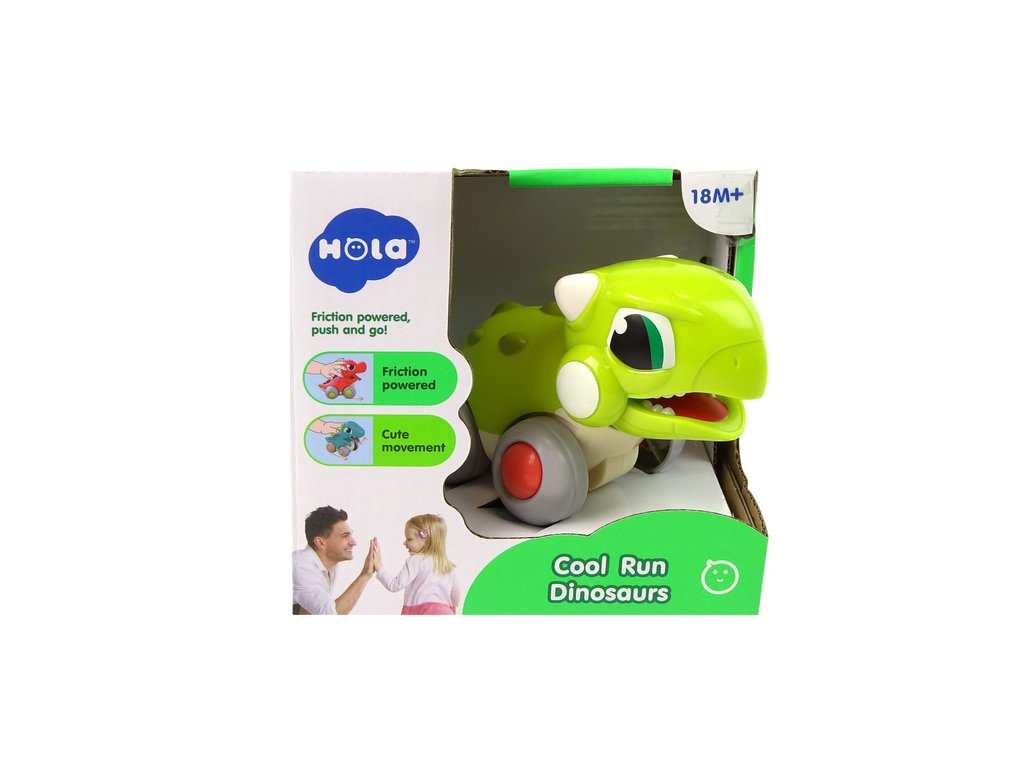 Figurka představuje roztomilého zeleného dinosaura s bílým bříškem Stačí dinosaura přitlačit k podložce, pustit a obdivovat, jak se řítí vpřed