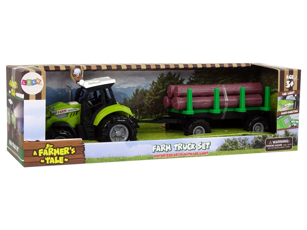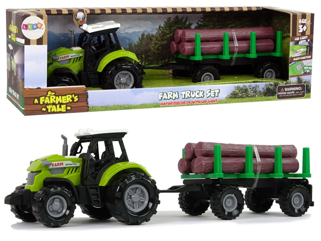 ZELENÝ TRAKTOR S PŘÍVĚSEM NA BALÍKY DŘEVA Traktor s přívěsem je ideální hračkou pro malé milovníky zemědělství, kteří se chtějí cítit jako opravdoví farmáři Díky realistickému vzhledu a funkcím si dítě může hrát na přepravu dřeva a práci na farmě
