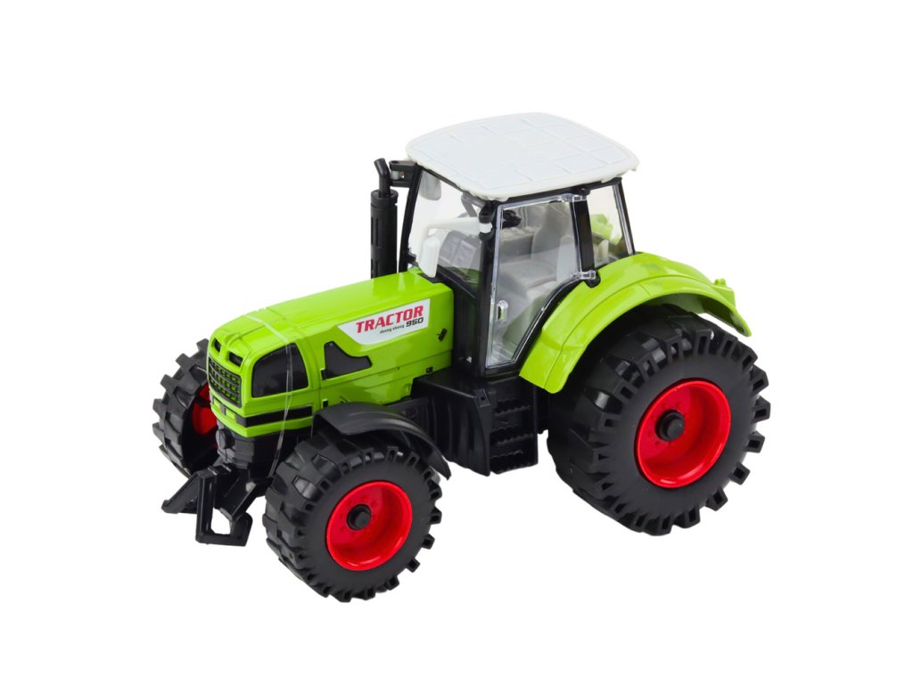 Zelený traktor s přívěsem, setrvačníkový pohon, otevírací maska a dveře