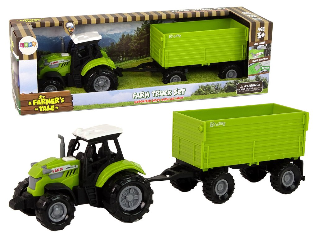 Traktor s přívěsem nabízí možnost připojování a odpojování přívěsu, což dětem dává plnou volnost v rozhodování o způsobu hraní. Ergonomické rozměry traktoru a přívěsu jsou uzpůsobeny malým dětským ručičkám, což usnadňuje uchopení, řízení a manévrování vozidlem. Traktor je vyroben v klasické zelené barvě, která připomíná zemědělské stroje. Velká a odolná kola zajišťují stabilitu a možnost pohybu po různých površích. Skvělou atrakcí jsou také světelné a zvukové efekty, které se spustí stisknutím bílého tlačítka na vozidle. Díky realistickým zvukům a blikajícím světlům se děti mohou cítit jako skuteční traktoristi.