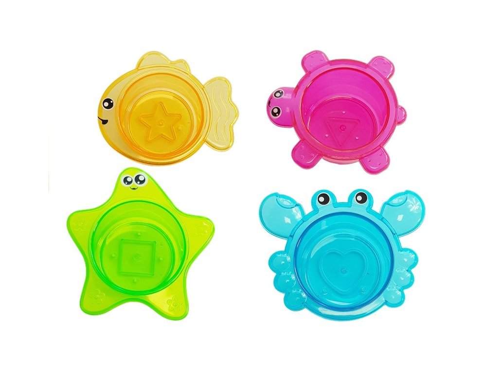 - Plastové kelímky ve tvaru mořských zvířátek (hvězdice, rybičky, krab, želva) mají otvory, díky kterým může dítě pozorovat různé proudy vody a hrát si s nimi