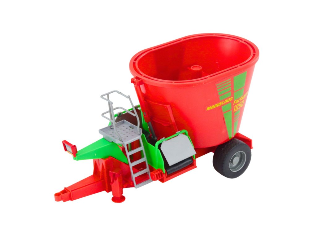 Traktor je vybaven napájecím mechanismem, který umožňuje jeho pohyb vpřed jednoduchým postrčením. Červený přívěs s míchacím zařízením na krmivo přidává realistický dotek, který dětem umožňuje simulaci každodenního života na farmě. Všechny materiály použité při výrobě jsou trvanlivé a bezpečné pro dětskou hru, což zajišťuje hodiny tvořivé zábavy.