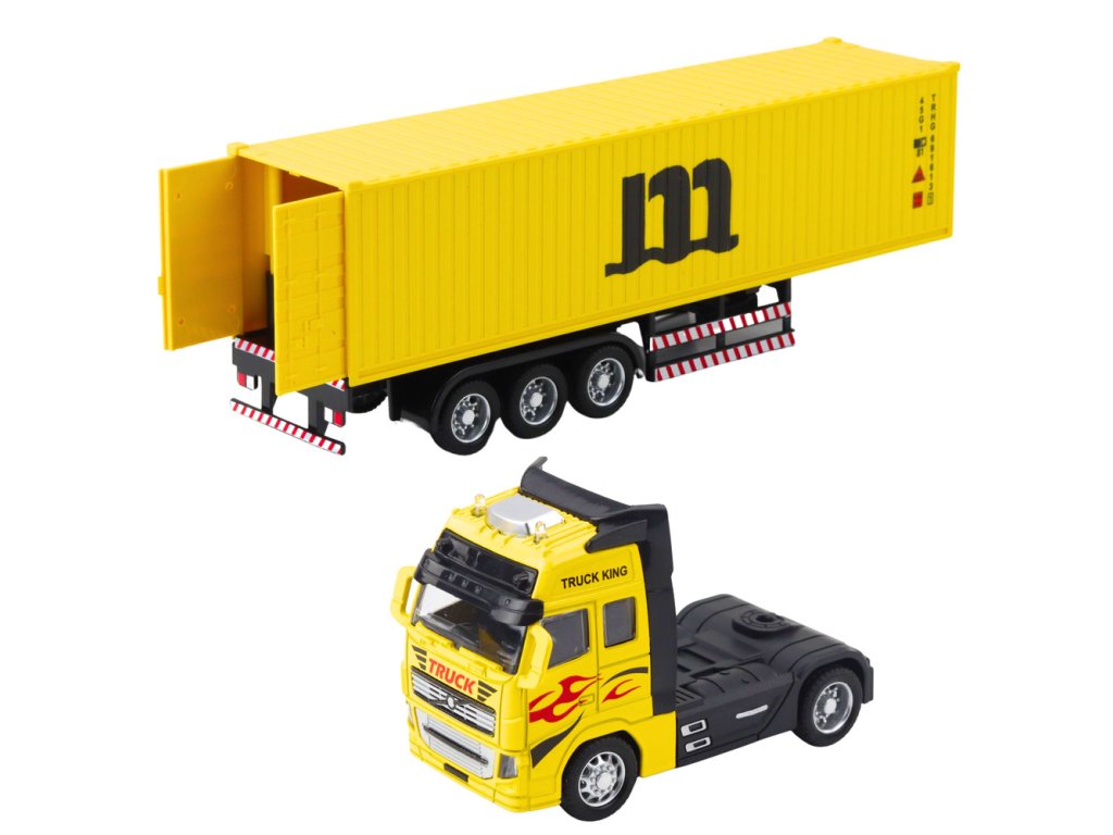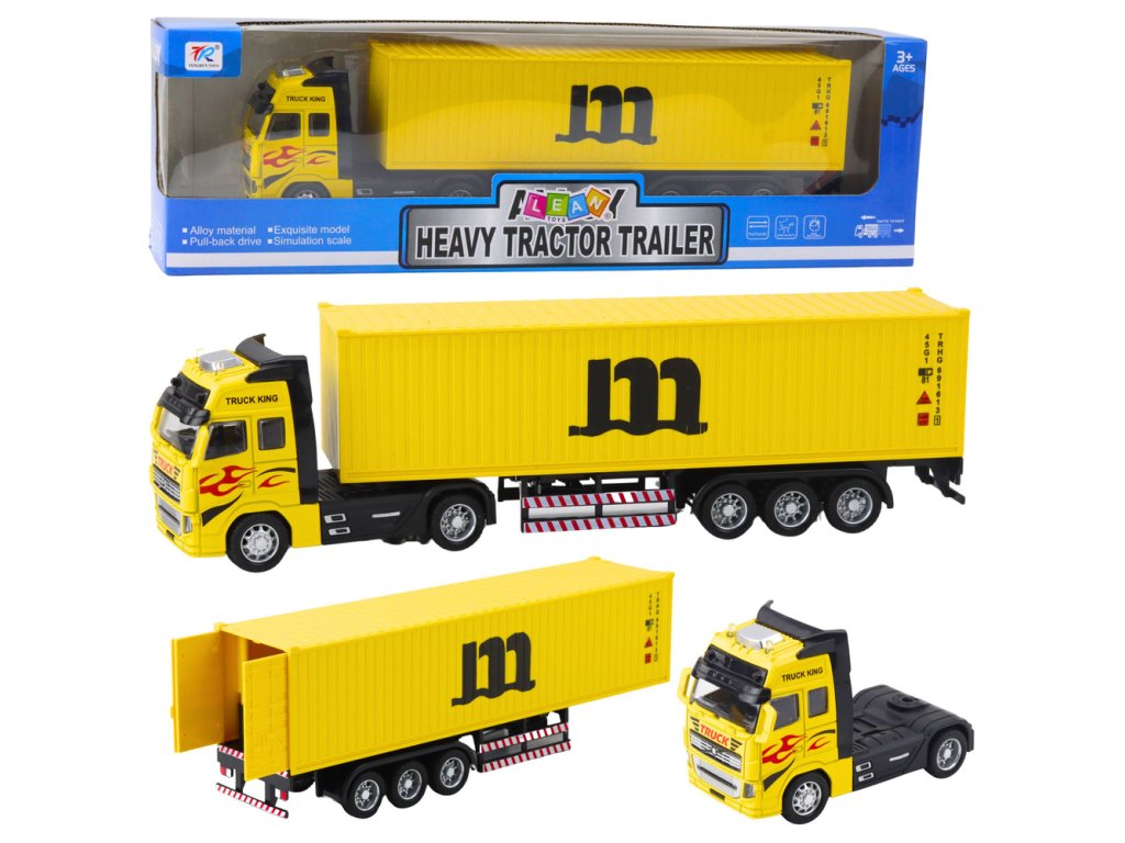 Žlutý model nákladního auta s kovovou kabinou a kontejnerem s pohonem Pull Back