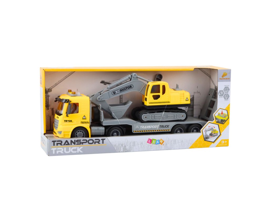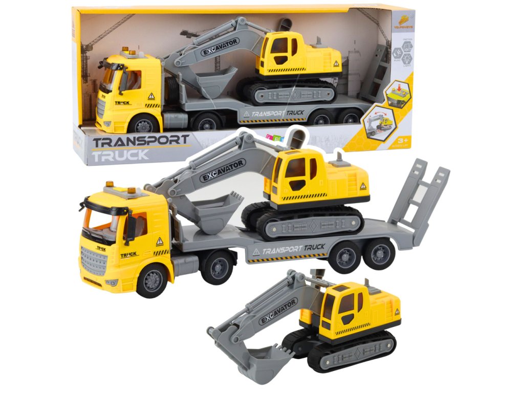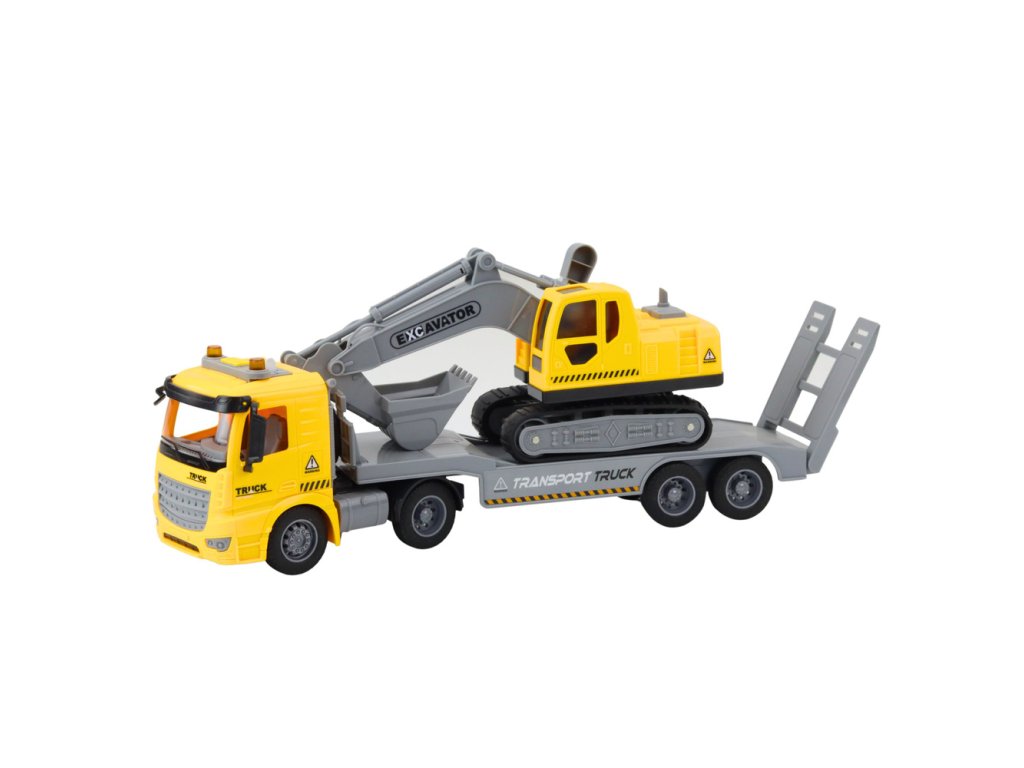 Žlutý silniční přepravník s pásovým rypadlem je skvělou volbou pro malé fanoušky motorismu a stavebních strojů.
