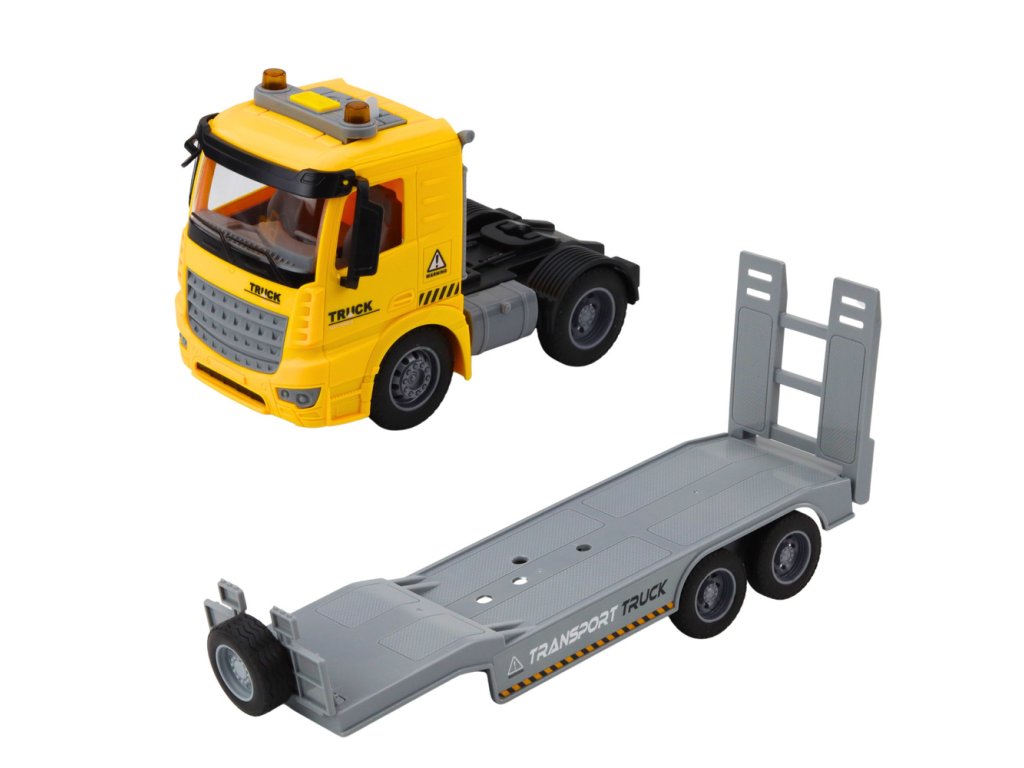 - Žlutý silniční přepravník s pásovým rypadlem je skvělou volbou pro malé fanoušky motorismu a stavebních strojů