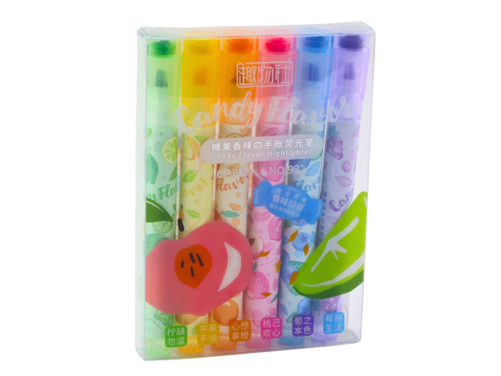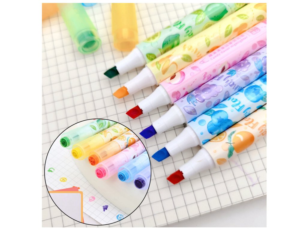 Barevné ovocné zvýrazňovače s razítkem – Sada 6 kusů Při studiu a práci si přidejte trochu radosti s naší sadou barevných zvýrazňovačů, které kombinují funkčnost se zábavou!
